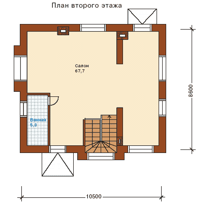 Второй этаж не имеет разделения на комнаты, а представляет собой единый салон общей площадью 67,7 кв. м., что предоставляет возможность свободной планировки на усмотрение хозяев коттеджа.