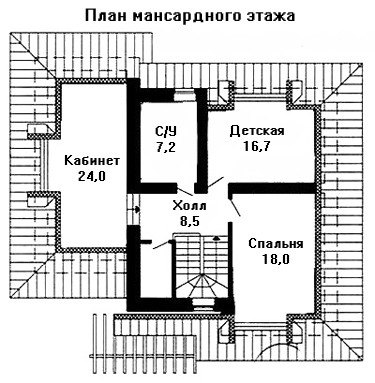 Гараж выполнен в виде пристройки к основному объёму здания, над ним располагается кабинет хозяина дома. Мансардный этаж оборудован двумя спальнями, ванной и гардеробной комнатами.