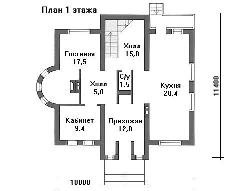 Внутреннее пространство дома имеет чёткое зонирование, по центральной оси дома находится просторный холл, по одну сторону которого разместилась кухня-столовая с выходом на небольшую открытую террасу, обращённую в сад. С другой стороны – просторная гостиная с эркером и большим камином. По соседству с гостиной находится кабинет, который может служить также гостевой спальней.