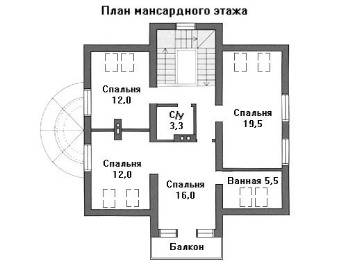На мансардном этаже находятся три спальни и ванная комната. Спальня хозяев дома представляет собой просторные апартаменты с персональной ванной комнатой, в эркере с эффектным арочным окном отведено место для будуара и имеется выход на балкон.