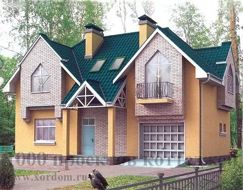 Современный загородный коттедж с классическими формами, симметричным фасадом, многоскатной крутой кровлей, украшенный оригинальными эркерами, выразительно оформленным главным входом с пилонами. Дом предназначен для сезонного проживания небольшой семьи в составе 2-4 человек, но при желании в доме можно проживать круглогодично, если техническое помещение с отдельным входом со стороны участка, смежное с помещением гаража, оборудовать как котельную.