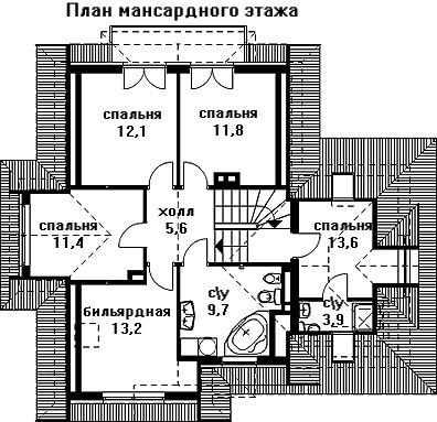 Мансардный этаж представляет собой зону для отдыха и сна, здесь удобно разместились 4 спальни, просторная ванная комната с джакузи и бильярдная, которая может быть по желанию заказчика и рабочим кабинетом с библиотекой, и дополнительной спальней, и домашним кинотеатром. Спальня хозяев дома оборудована персональным санузлом.