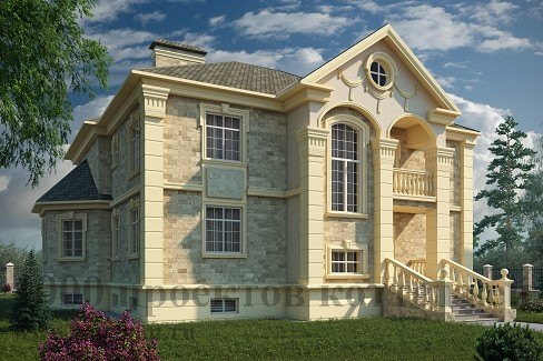 Солидный коттедж из кирпича с двумя этажами и полноценным цоколем понравится респектабельным современным семьям, предпочитающим изысканные классические формы в архитектуре. Приятные светлые фасады, украшенные дизайнерским декором, изящные колонны, многогранные эркеры и окна арочной формы все это поддерживает общий стиль особняка и подчеркивает его незаурядность.