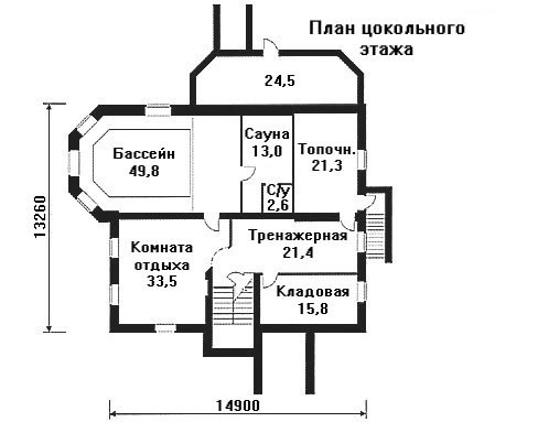 Все помещения, предназначенные для спортивного отдыха, располагаются на территории цокольного этажа. Помимо непосредственно сауны там же находится большой бассейн, комната для отдыха площадью 33,5 кв. м. и тренажерная. Кладовая комната и топочная размещены так же на территории цоколя.