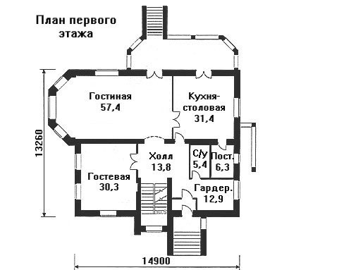 Главным помещением первого этажа является светлая гостиная комната с эркером по одной из стен. Из нее, как и из расположенной рядом кухни, можно выйти на придомовую террасу с выходом в сад. В коттедже четыре спальни, запроектированные на втором этаже.