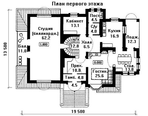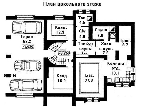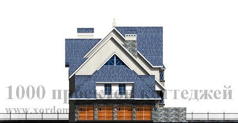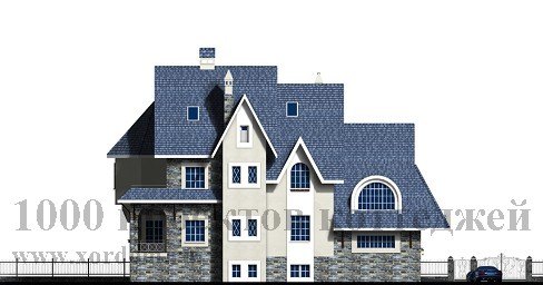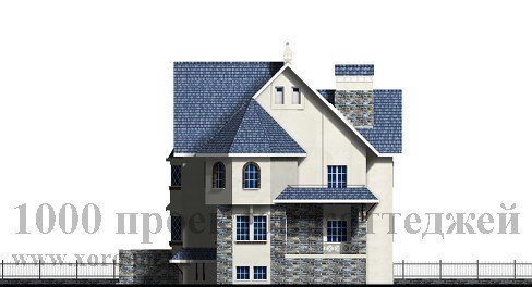 Проект загородного коттеджа из кирпича с остроконечными сводами многоуровневой крыши, многогранными эркерами и арочными окнами напоминает средневековый замок в современном исполнении. В коттедже три уровня, один из которых цокольный этаж. Его территория принадлежит просторному гаражу на четыре автомобиля, зоне хозяйственных помещений и спортивно-оздоровительному блоку с бассейном, тренажерным залом, комнатой отдыха и сауной. Теме комфортабельного отдыха уделено большое внимание в данном проекте и помимо оздоровительного комплекса в цоколе на первом этаже в дополнение предусмотрен просторный бильярдный зал площадью 62,2 кв. м. с выходом на небольшой балкон. Помимо стандартных для первого этажа кухни, столовой и гостиной так же здесь находится рабочий кабинет размером 13,1 кв. м.