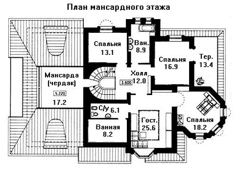 Четыре комнаты для ночного отдыха делят между собой мансарду, три из них спальни для владельцев коттеджа и одна предназначена для размещения гостей.