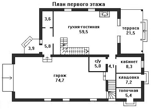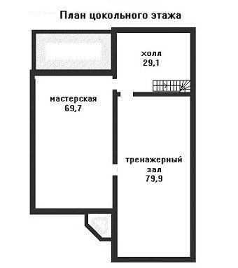Весь цоколь разделен на две части, одну из которых занимает просторнейший тренажерный зал размером 79,9 кв. м., а вторую – большая мастерская площадью 69,7 кв. м. Кухня и гостиная комната, расположенные на первом этаже, совмещены друг с другом и имеют выход на придомовую террасу.