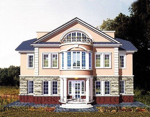 Просторный особняк из кирпича в стиле «ампир» оформлен в лучших классических архитектурных традициях. Округлое крыльцо обрамлено изящными колоннами, а в роли крыши для него выступает полукруглый эркер второго этажа, застекленный по всей длине. Общая архитектурная концепция дома напоминает скорее русские усадьбы прошлых веков и оставляет впечатление надежности и домашнего гостеприимства.