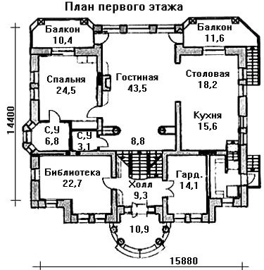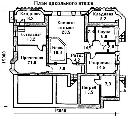 Полноценный цокольный этаж, предусмотренный проектом, разделен между хозяйственными помещениями и банным блоком с комнатой для отдыха, сауной, бассейном и гидромассажной комнатой. Основным акцентом первого этажа является широкая гостиная с камином, объединенная с территорией столовой, перетекающей в кухню. Отсюда можно выйти на небольшой балкон с обратной стороны дома. Планировка этажа так же дополнена спальной комнатой и библиотекой.