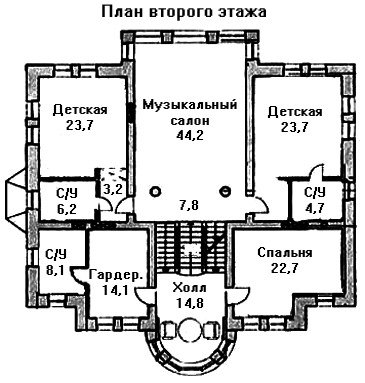 Второй этаж особняка это родительская спальня и две детские комнаты, территория между которыми отведена под музыкальный салон.