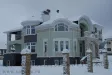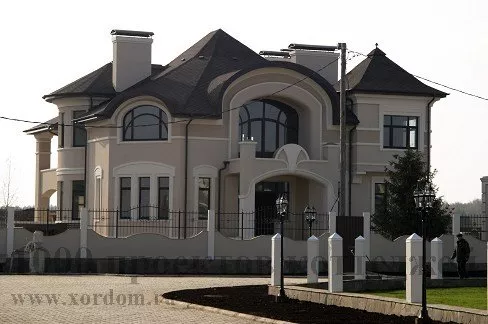 Комфортабельный трехуровневый особняк их кирпича предлагает 7 комнат и спроектирован специально для сложных земельных участков неправильной формы, расположенных на возвышенности. Внешним очарованием своих фасадов коттедж обязан русскому модерну. К парадному входу в дом ведет полукруглое крытое крыльцо с несколькими ступенями. Крышей для него служит балкон второго этажа.
