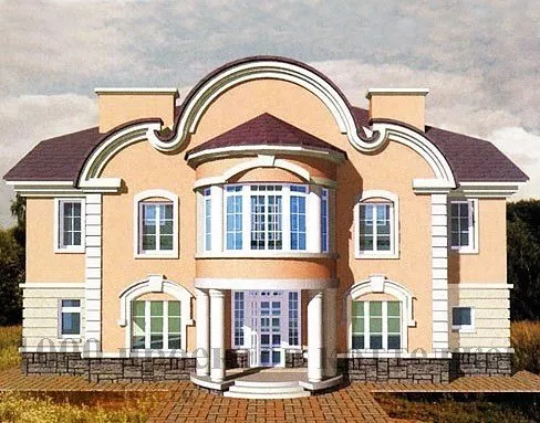 Респектабельный загородный коттедж из кирпича в стиле дворянских усадеб прошлых веков предлагает семь комнат и радует превосходной архитектурой, в которой можно проследить черты ампира начала 19 века. Интерьер внутренних помещений можно организовать достаточно индивидуально и с большой фантазией, благодаря смещению помещений в пол-этажа. Такое проектировочное решение благоприятно для участков с небольшим перепадом рельефа и нисколько не усложняет использование цокольного этажа.