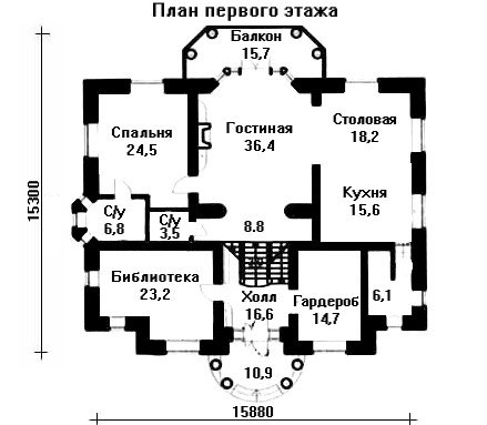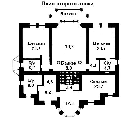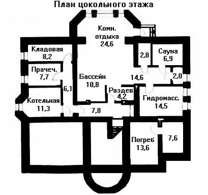 Банный блок занимает основную часть цоколя и состоит из бассейна, комнаты для отдыха и сауны. Остальная часть этажа принадлежит хозяйственным помещениям. Первый этаж может похвастаться просторной двусветной гостиной комнатой с уютным камином и выходом на балкон. Справа от нее находится территория кухни и столовой, а слева – спальня. Еще одной комнатой первого этажа является достаточно большая библиотека. Второй этаж представляет собой территорию для ночного отдыха и состоит из двух детских и одной спальни.