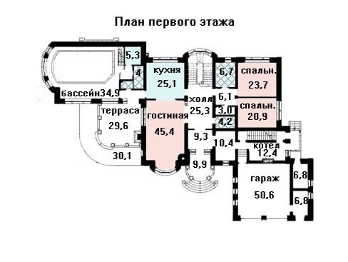 В доме два полноценных этажа и небольшая мансарда. Спортивно-оздоровительные помещения расположены в левой части этажа и включают в себя просторный двухсветный бассейн и сауну с душевой. Центральную часть занимает гостиная комната площадь 45,4 кв. м. и кухня. Справа находятся спальни и двухместный гараж размером 50,6 кв. м.