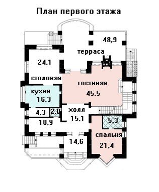 Большая придомовая терраса предлагает территорию 48,9 кв. м. и оснащена камином, где можно комфортно расположиться всей семьей для совместного чаепития. Выход на террасу осуществляется не только из большой гостиной комнаты, так же оснащенной камином, но и из территории столовой, расположенной рядом. Одна из спален дома запроектирована на первом этаже, что очень удобно при наличии членов семьи в преклонном возрасте, иначе ее вполне можно переоборудовать в гостевую комнату.