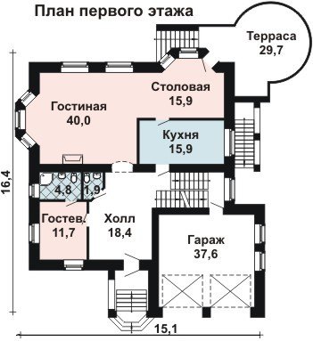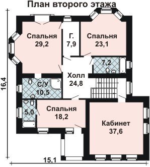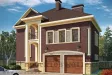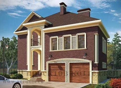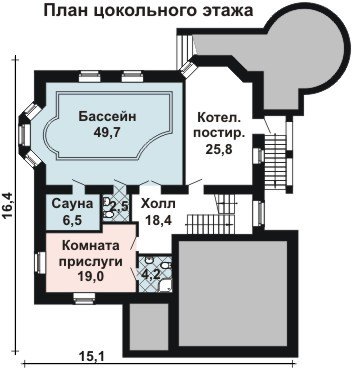 Стильный и запоминающийся проект загородного коттеджа из кирпича придется по нраву современным семьям составом от 3 до 7 человек. Это приятно оформленный внешне дом с прекрасной внутренней планировкой и четырьмя жилыми уровнями. На первом уровне, в цоколе, находится довольно большой бассейн с сауной. Тут же на этаже расположены хозяйственные помещения и комната для персонала.