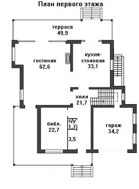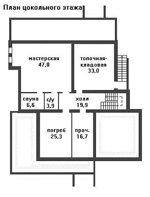 В цоколе находится большая мастерская и ряд хозяйственных помещений. Территория первого этажа разделена между кухней-столовой и гостиной с домашним камином. Обе комнаты имеют собственный выход на большую придомовую террасу, протянувшуюся вдоль всей задней стены дома. Гараж, расположенный на уровне первого этажа занимает площадь 34,2 кв. м.