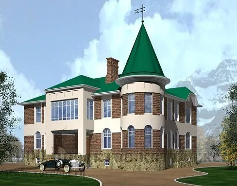 Трехуровневый кирпичный особняк, дизайном фасадов напоминающий замок, выглядит запоминающимся и оригинальным среди любого ландшафта. Основным украшением экстерьера дома является полукруглый эркер в высоту всего коттеджа с отдельной крышей, напоминающий башню. Такой особняк будет уместен не только в качествен основного постоянного жилища, но я в качестве загородного дома для сезонного отдыха или же небольшой оригинальной базы отдыха.
