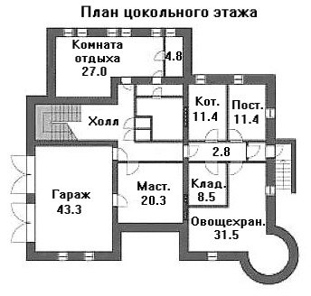 Планировка внутренних помещений строго зонирована. Так, цоколь включает в себя хозяйственные помещения двухместный подземный гараж, соседствующий с небольшой мастерской. Рядом расположено овощехранилище и кладовая. Тут же на этаже находится комната для отдыха, а так же ряд дополнительных хозяйственных помещений.