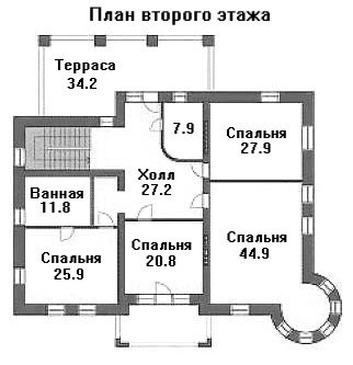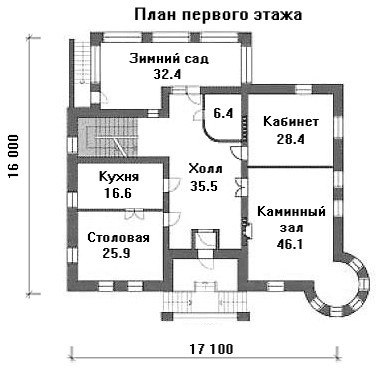 Роль гостиной комнаты выполняет просторный каминный зал с круглым эркером. Рядом находится кабинет, а напротив – кухня и столовая. Из большого холла с лестницей можно выйти в большой зимний сад. На втором этаже находятся апартаменты для ночного отдыха.