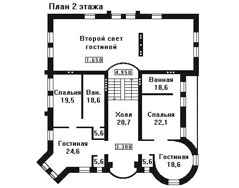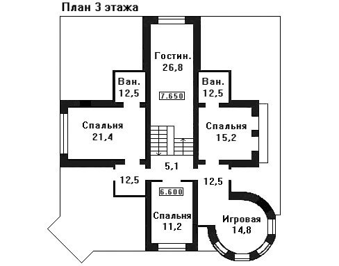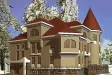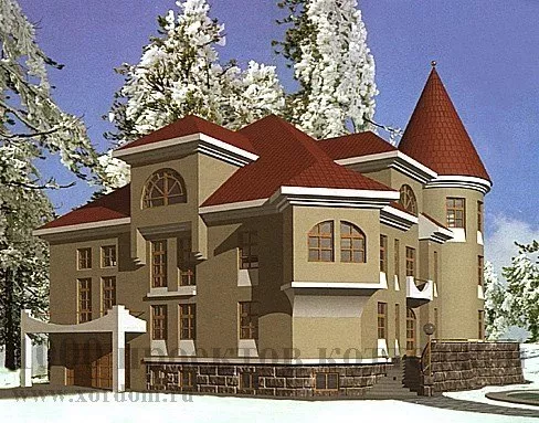 С виду напоминающий замок-дворец этот яркий особняк станет прекрасным постоянным жилищем для семьи, предпочитающей замковый стиль вкупе с современными тенденциями в архитектуре домов. Главным украшением коттеджа является островерхая башня-эркер, так же позволяющая создать неповторимый интерьер внутри дома. По планировке в данном эркере размещена столовая, практически совмещенная с территорией кухни. Двусветная гостиная, объединенная с каминным залом, занимают почти половину первого этажа.