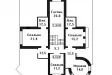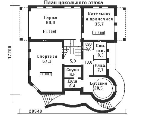 В цоколе находится подземный гараж площадью 60 кв. м., а так же большой банный блок с бассейном, спортивным залом и сауной. На втором этаже запроектированы две спальни с собственными санитарными узлами, а так же длинная гостиная комната, протянувшаяся через холл вдоль всей передней стены особняка.