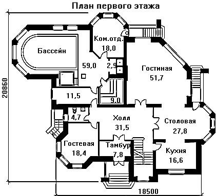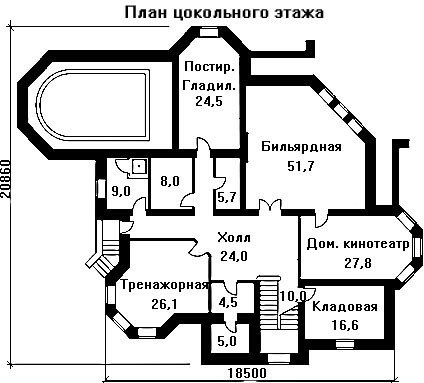 Техпомещение под бассейн, бильярдную и спортзал, комната для домашнего кинотеатра – это почти полный состав цоколя, не считая постирочной, котельной и нескольких кладовых. Сам же бассейн размещается на территории второго уровня, то есть на первом этаже, вблизи от комнаты для отдыха и блока с сауной и душем. Территория кухни, уютная гостиная, помещение столовой располагаются в правой части уровня.