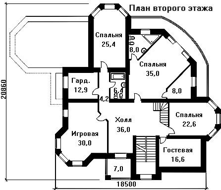 На территории второго этажа предполагается пять комнат, при этом три из них предназначены для ночного отдыха хозяев дома, одна представляет собой комнату для проживания гостей, и еще одна – игровую зону.