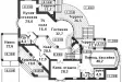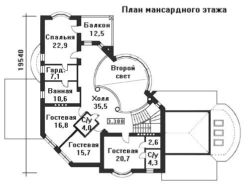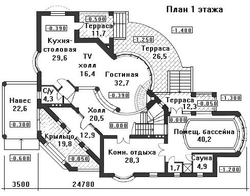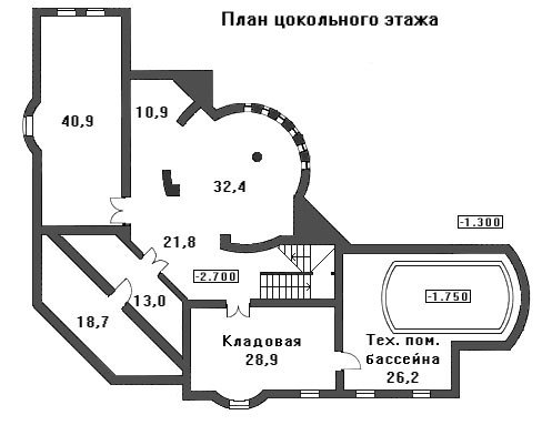 Весь цоколь отдан под технические помещения, а так же предполагает наличие нескольких комнат свободного назначения, где вполне можно оборудовать, например, спортзал. На первом этаже находится основная масса жилых помещений дома. Бассейн находится в правом крыле этажа и граничит с небольшой сауной и комнатой для отдыха. Левое крыло этажа отдано под кухню-столовую объединенную с TV-холлом и полукруглой двусветной гостиной. В мансарде четыре комнаты, подходящие для обустройства спален и гостевых.