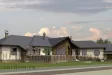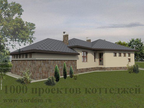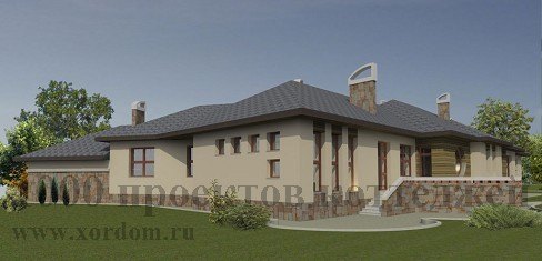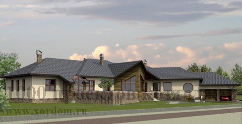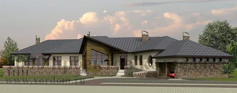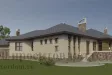 Просторный одноэтажный особняк из кирпича для удобства разделенный на две зоны – дневного пребывания и спальную. Внешне коттедж имеет приятную глазу отделку декоративным камнем и украшен выступающим треугольным эркером слева от парадного входа. Оригинальный внешний вид особняку придает ломаная линия его форм, делающая внутреннюю планировку отличной от традиционной.