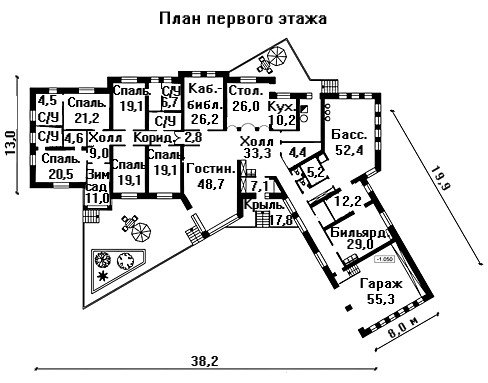 Гараж-пристройка, расположенный в правой части коттеджа, рассчитан на два авто и занимает площадь 55,3 кв. м. Рядом с ним находится бильярдный зал, а дальше по коридору – бассейн. Через просторный холл площадью 33,3 кв. м. можно пройти в большую гостиную комнату или напротив на территорию кухни и столовой. В левой части особняка находится спальная зона, где, не считая санитарных узлов, компактно расположены пять спален и кабинет-библиотека.