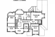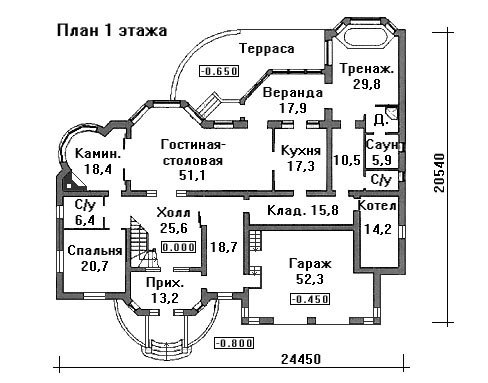 В проекте учтен просторный гараж на два авто размером 52,3 кв. м. Гостиная и столовая объединены в одно помещение и образуют комнату нестандартной «ломаной» формы, откуда можно пройти в небольшой каминный зал с одной стороны или в помещение кухни – с другой, а так же попасть на веранду размером 17,9 кв. м. На этаже так же предусмотрена развлекательно-оздоровительная зона с тренажерным залом и сауной.