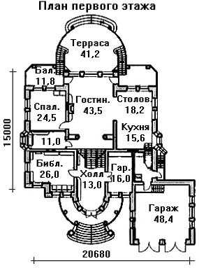 В проекте предусмотрен полноценный цоколь с бассейном, банным блоком и комнатой для отдыха с камином. Тут же находится мастерская и ряд хозяйственных и технических помещений. Гостиная комната оснащена камином и занимает центральное место на первом этаже, позволяя пройти в одну из прочих жилых комнат. Справа от нее находится столовая и кухня, а слева библиотека и спальная комната. Гаражное помещение на два авто также расположено на уровне первого этажа и предлагает площадь 48,4 кв. м.