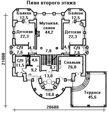 Комнаты второго этажа – две детские и «хозяйская» спальня, размещены вокруг общего музыкального салона, оборудованного камином.