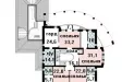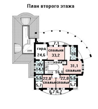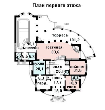 Проект предусматривает наличие округлой террасы площадью 101,2 кв. м., огибающей половину особняка со стороны сада. В помещении размером 90,1 кв. м. расположен бассейн, соседствующий с небольшим банным блоком. Прямоугольная гостиная первого этажа занимает территорию в 83,6 кв. м. и позволяет выйти на террасу.