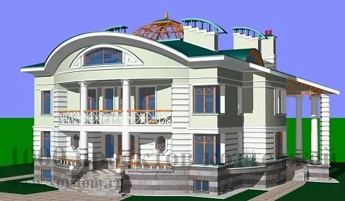 Величественный особняк из кирпича с благородными фасадами, украшенными в лучших дворцовых традициях, будет радовать глаз своих жильцов и их гостей каждый день. Приятный «мягкий» дизайн экстерьера дома обязан своим обликом округлым формам большинства элементов отделки, очаровательному крылечку, обрамленному колоннами, а также округлой форме самого коттеджа.