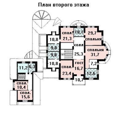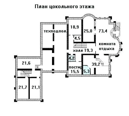 Цокольный этаж это несколько технических и хозяйственных помещений, а так же банный комплекс с сауной и комнатой для отдыха. Второй этаж принадлежит стандартному набору традиционных помещений для дневного пребывания, включая гостиную с камином, столовую и кухню. Кроме того здесь же на этаже находятся три спальные комнаты. Еще семь спален размещены на втором этаже, причем две из них вынесены за пределы основного здания над гаражом, по площади рассчитанным на две машины.