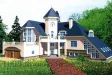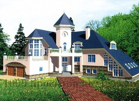 Комфортабельный особняк из кирпича в трех уровнях с оригинальными элементами в дизайне экстерьера прекрасно подойдет для постройки на земельных участках нестандартной близкой к треугольной формы. Сама форма здания Г-образная, что делает внутреннюю планировку достаточно удобной и логичной. Фасады особняка украшены эркерами и многочисленными окнами, крыльцо обрамлено в колонны, а башенка с часами над парадным входом придает общей конструкции коттеджа внешнее очарование старинной ратуши. Благодаря такой концепции формы дома образовывают внутренний дворик с террасой 17,7 кв. м.