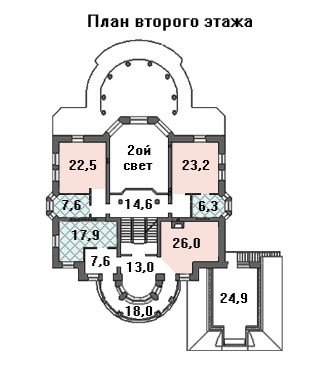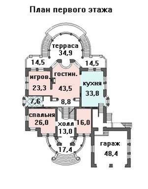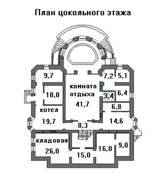 В помещении цокольного этажа находится небольшая сауна, комната отдыха, а также несколько технических помещений. Вход на первый этаж расположен с фронтальной стороны здания через привлекательное полукруглое крыльцо, к которому ведут красивые ступени. Рядом с крыльцом расположен закрытый гараж, рассчитанный на одновременную стоянку двух автомобилей. Со стороны заднего дворика раскинулась шикарная полукруглая солнечная терраса, которую с двух сторон украшают ступени. На втором этаже находится балкон полукруглой формы, а также второй свет, который идеально дополнит вечер в кругу семьи или дружеской компании.