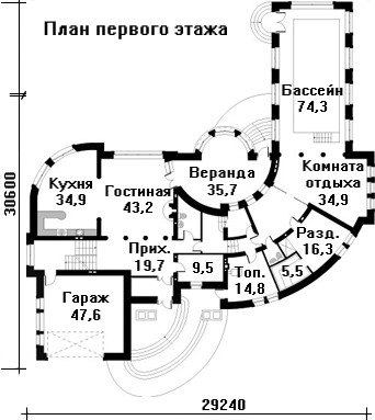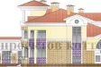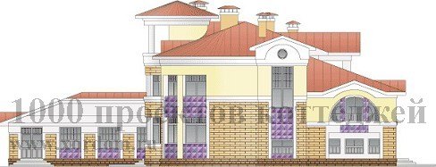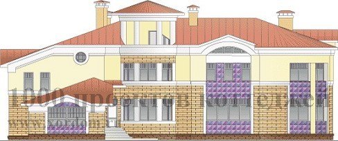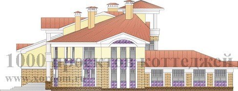 Просторный особняк из кирпича причудливой Г-образной формы с округлыми углами предназначен для постройки на достаточно больших земельных участках. Дом прекрасно подходит для постоянного проживания в течение круглого года. Такой особняк будет радовать глаз не только хозяев дома, но и каждого прохожего своими великолепно оформленными фасадами и формами.