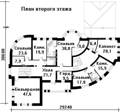 В доме предусмотрен просторный бассейн с комнатой для отдыха, а так же двухместный гараж площадью 47,6 кв. м. В центральной части первого этажа расположена гостиная комната с кухней и несколько хозяйственных помещений. Второй этаж состоит из семи комнат, назначение которых – спальная зона, за исключением достаточно просторного бильярдного зала площадью 47,6 кв. м., расположенного прямо над гаражом. В мансарде размещены отдельные апартаменты, представляющие собой студию размером 36 кв. м. с кухней, санузлом и гардеробной.