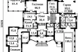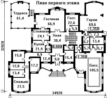 В проекте предусмотрено размещение двух автомобилей на территории гаража, размещенного на уровне первого этажа. Миновав несколько хозяйственных помещений можно попасть в достаточно большой бассейн с банным блоком. В проекте достаточно большое количество комнат, шесть из которых предназначена для организации спален с собственными гардеробными и санузлами, а остальные предполагают свободное назначение на усмотрение хозяев особняка.