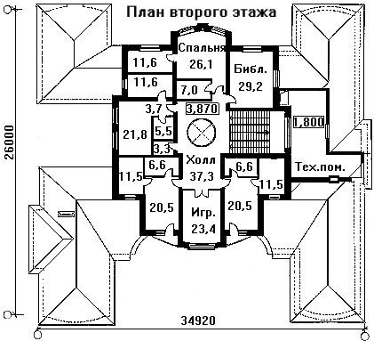 Просторный загородный коттедж из кирпича в стиле итальянской виллы - два этажа и максимальный набор функциональных помещений, компактно размещенных на всей его территории. Дом прекрасно подойдет для круглогодичного пребывания достаточно большой семьи. Особое значение в проекте придается освещению, ради которого по периметру всего здания довольно часто расположены высокие окна, ориентированные на максимальную пропускаемость дневного света и тепла. Небольшое крылечко, крышей которому служит второй этаж, предваряет парадный вход в особняк. Большой холл площадью 30 кв. м. ведет прямо в гостиную комнату с камином размером 66,9 кв. м., украшенную глубоким эркером по одной из ее стен. Отсюда можно выйти на придомовую террасу с обратной стороны коттеджа.
