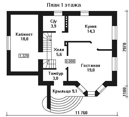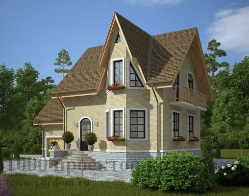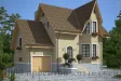 Современный загородный коттедж выделяется своим выразительным внешним видом, остроконечной кровлей, изысканной отделкой фасада, чётко обозначенным главным входом, организованным с высокого круглого крыльца. Дом предназначен для постоянного проживания семьи из 3-4 человек.