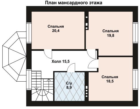 На площади мансарды разместились три просторные спальни и ванная комната общего пользования.