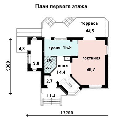 Внутренняя планировка дома очень простая, но в тоже время исключительно эргономичная и комфортная. На первом этаже находится зона дневного пребывания и приема гостей. Для этого на этаже спроектированы большой гостиный зал, отделённый от холла и кухни-столовой арочными проёмами. Из кухни имеется выход на небольшую открытую террасу.