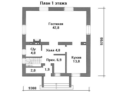 На первом этаже планировочным решением предусмотрен минимум помещений, на нем разместились каминный зал, кухня, ванная комната, кладовая. При необходимости проживания в доме круглогодично можно выделить место для установки котла в помещении прихожей.
