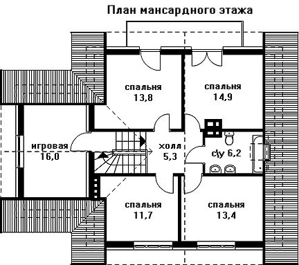 Приватная зона мансарды поделена на 4 спальни и ванную комнату с джакузи. Две смежные спальни имеют выход на общий балкон.