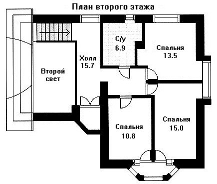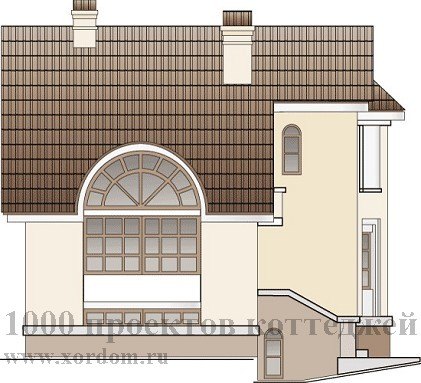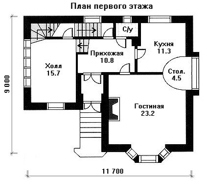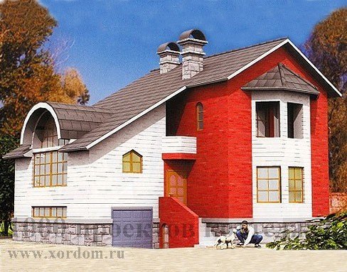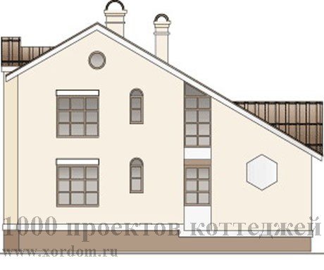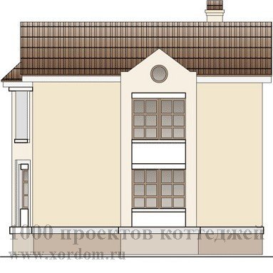 Небольшая площадь дома при рациональном и продуманном планировании позволяет достичь высокого уровня комфорта, так как все необходимые помещения для проживания небольшой семьи в составе 3-5 человек в нем удачно организованы. Так, первый этаж представляет собой зону дневного пребывания, в которой размещены помещения просторного двусветного холла, уютной гостиной с большим камином, кухни и столовой, которая находится на небольшом возвышении в эркере между кухней и гостиной.